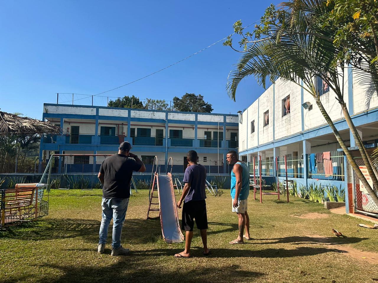 Ambientes equipados com piscina, academia, campo e quadra para esportes, refeitório, além de uma área ampla.